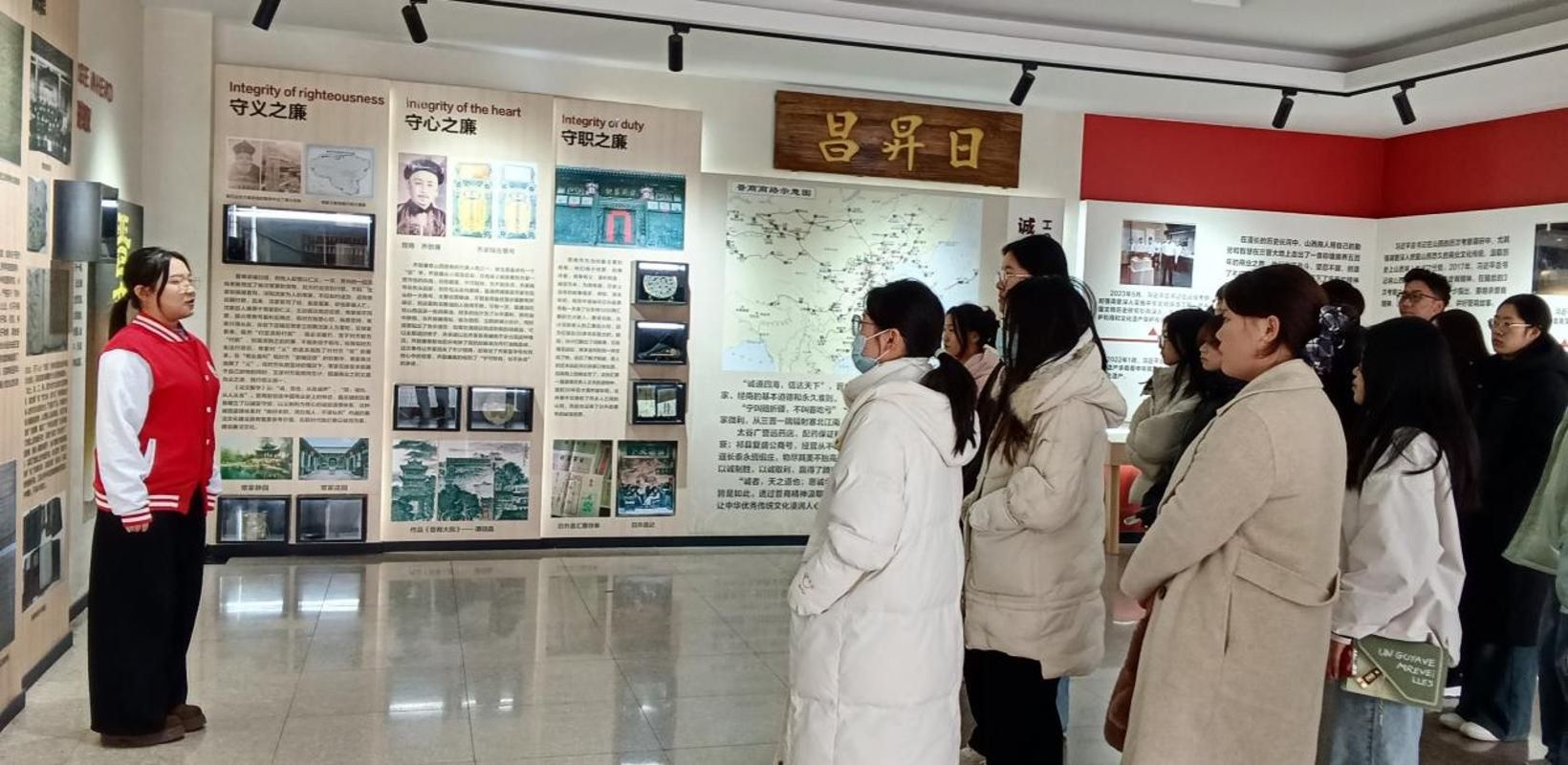 虽然天气寒冷,同学们还是冒风从北校早早赶到展馆。在展览馆里,同学们跟随讲解员重温晋商文化,通过学习晋商崛起历程中的典型人物与事件,重点探究了晋商文化,尤其是其管理体系中“守义”“守心”“守职”等理念所蕴含的清廉内核。